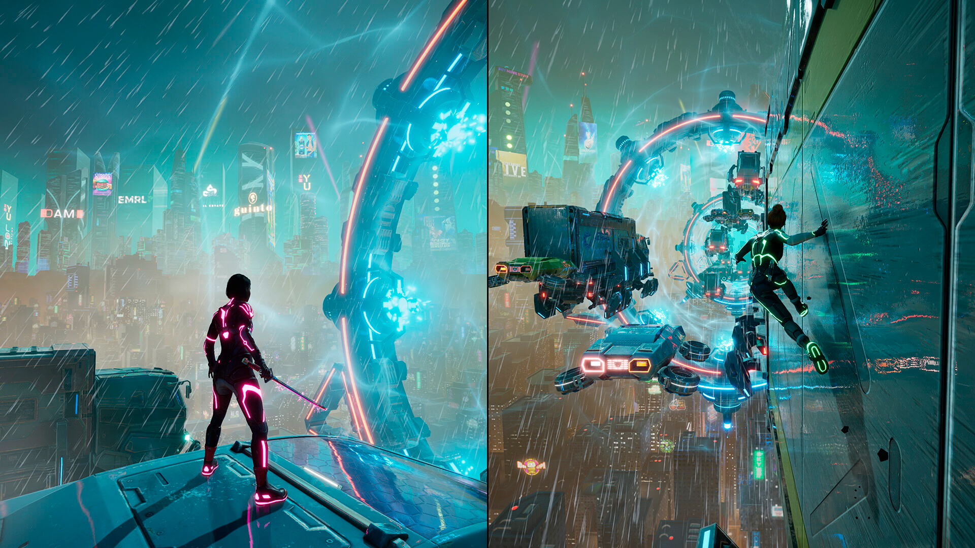 Técnicamente Split Fiction es un espectáculo con un nivel de detalle brutal y con escenarios con mucha más escala que en anteriores juegos de Hazelight. Ya sea en una ciudad muy cyberpunk con autos flotantes y edificios gigantes o reinos de fantasía con paisajes extraordinarios, siempre algo nos va a llamar la atención y hacernos decir “wow”. La versión de PC, con la cual fue realizado este análisis, corre muy bien y no me presentó ningún tipo de problema de rendimiento o bugs (por supuesto que la experiencia de cada usuario puede variar).
